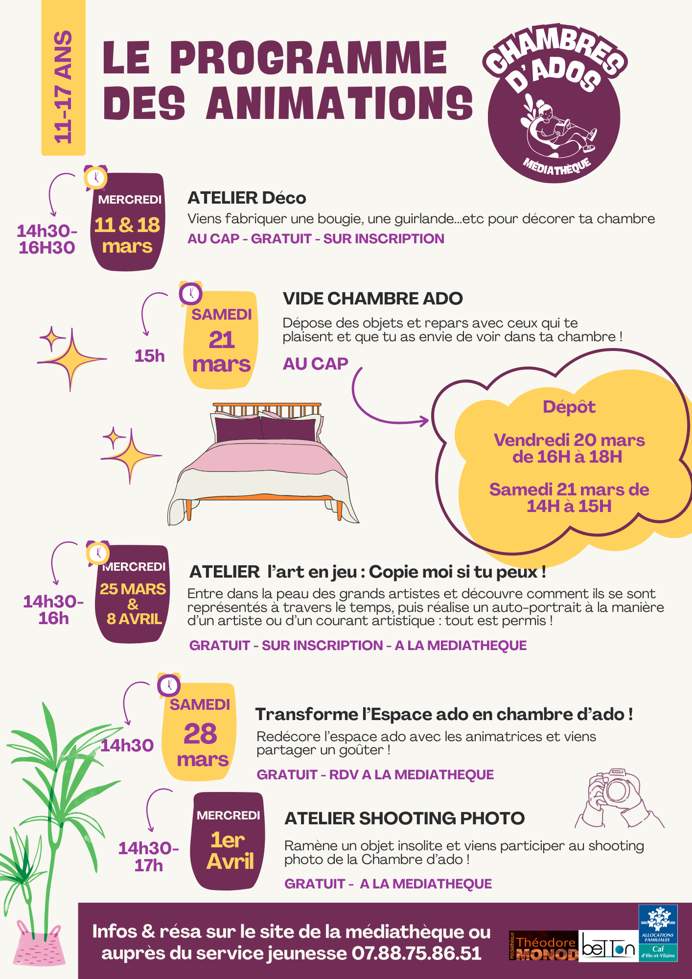 Pour toutes inscriptions aux activités jeunesse, contactez directement les animatrices soit par mail ou par téléphone. Aucune inscription via l’espace citoyen.